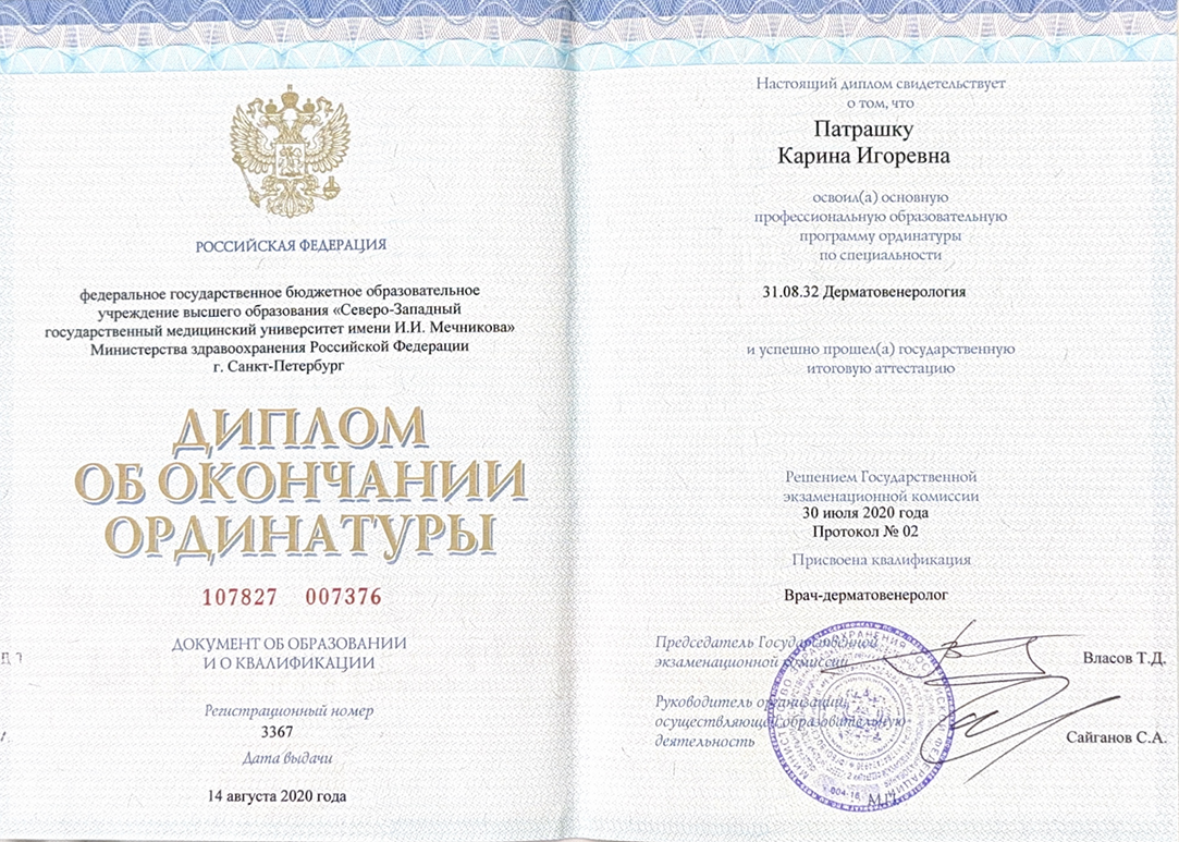 Освоила основную профессиональную образовательную программу ординатуры Северо-западного государственного медицинского университета имени И.И. Мечникова по специальности «Дерматовенерология» (2018г. — 2020г.)