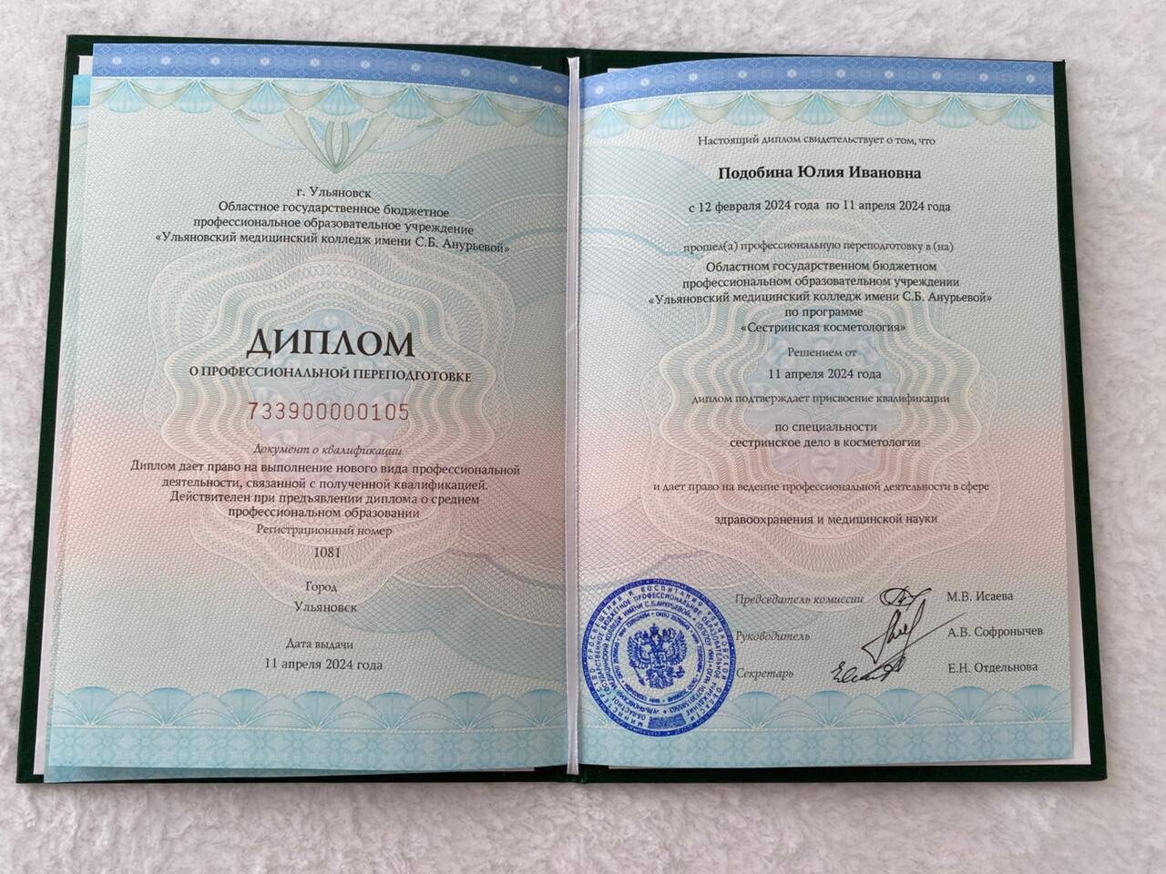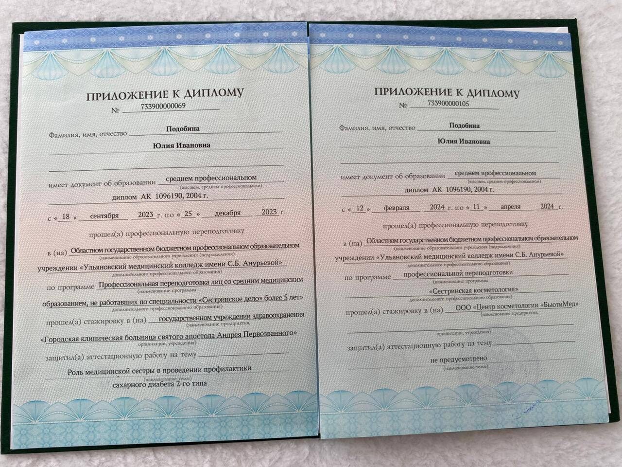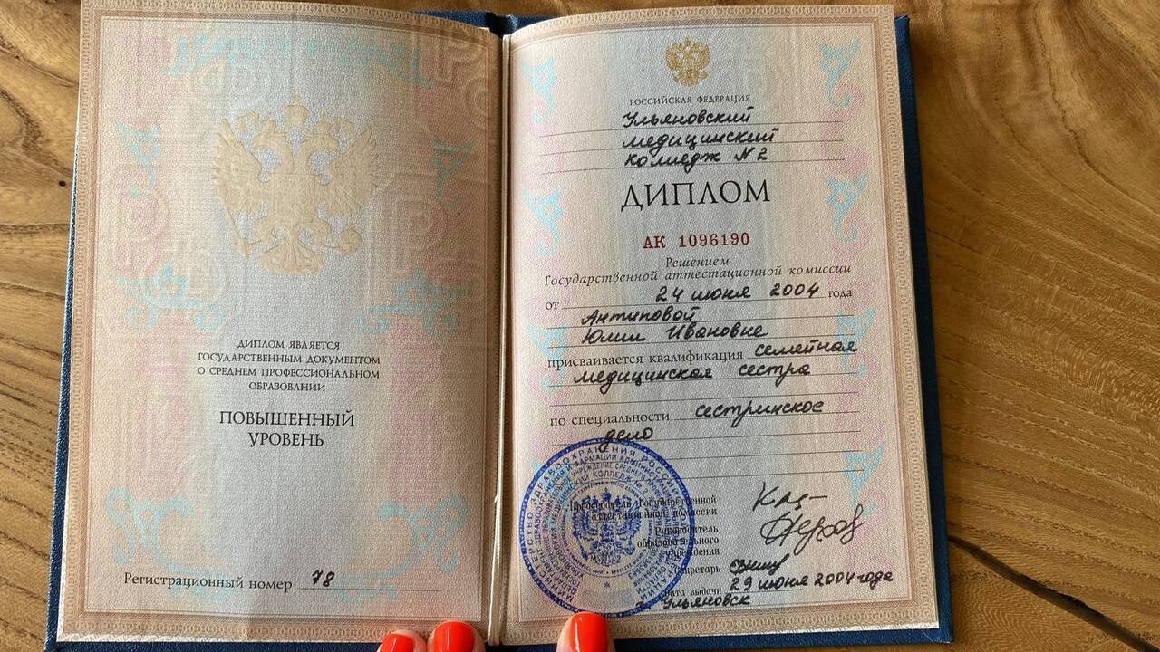 2000-2004 году закончила Ульяновский медицинский колледж по специальности сестринское дело, квалификация семейная медицинская сестра .